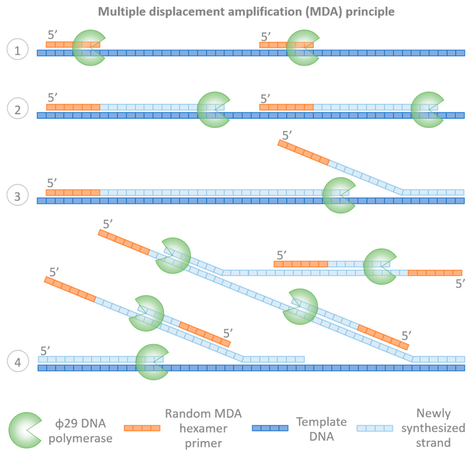 Principle of multiple displacement isothermal amplification (MDA): (1) During the annealing step, random MDA hexamer primers bind to the template DNA. (2,3) Strand elongation is achieved using phi29 DNA polymerase with strand displacement activity. (4) The reaction produces a hyperbranched DNA structure. taken from (1). (figure from https://www.qiagen.com).