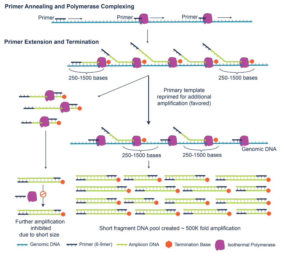 In PTA, a low proportion of termination bases are included in amplification, yielding shorter amplicons compared to a typical MDA reaction. The relatively small size of these amplicons favors subsequent priming of the primary template, thereby limiting the exponential propagation of biases and errors in daughter molecules. (figure from https://www.bioskryb.com/)